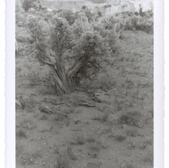 - Desert landscape, closeup of tree with twisted trunks, surrounded by scrub, chamisa and dirt; view of mountains visible in background.
